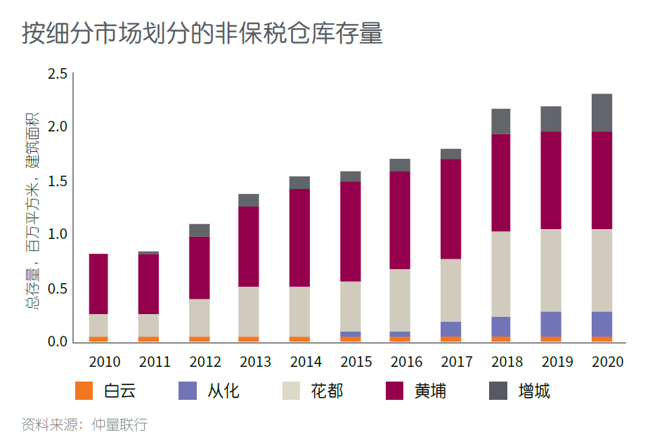 在办公楼、零售和酒店物业等业务均受到新冠疫情不同程度冲击的大背景之下,物流地产行业逆势发力,衍生出了巨大的驱动力,一跃成了炙手可热的资产类别。仲量联行进行了大量数据及资料调研,发布《大湾区房地产指南》,其中针对物流地产板块,该指南可视化呈现了大湾区重要基建规划,并对比了各城市非保税仓库的存量和租金水平。对于想了解广州物流配送市场或有意在广州布局仓储物流市场的企业、运营商和投资者来说,具有重要的参考价值。
