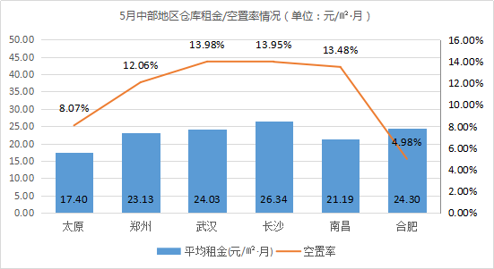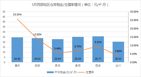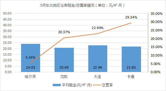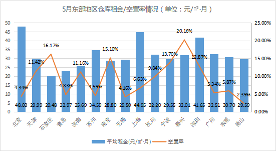 全国32个城市通用仓库平均租金为27.57元/㎡·月,环比下降0.79%。其中,东部地区仓库平均租金(32.08元/㎡·月)高于西部(23.85元/㎡·月)、中部(22.73元/㎡·月)、东北(22.38元/㎡·月)地区。相较4月,东北地区仓库平均租金有所下降,降幅为1.28%;东部、中部、西部地区仓库平均租金相对稳定,增(降)幅±1%以内。