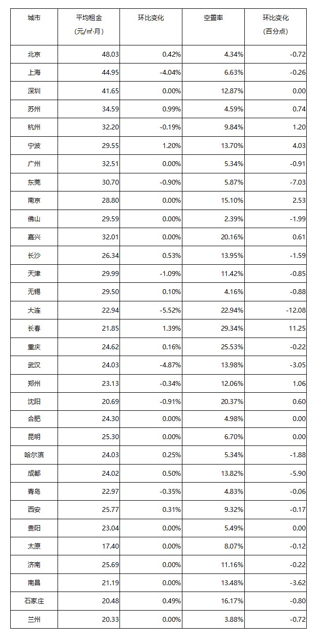 全国32个城市仓库平均租金、空置率变化的最大的城市是大连,租金环比下降5.52%,空置率环比下降12.08个百分点,甘井子区前盐村三兴果蔬批发市场因土地使用权过期将于6月15日关闭,部分商户不得不在市场关闭前另寻仓源,释放了部分租仓需求,尽管有需求释放,但由于大连仓储市场长期处于供大于求,为招揽客户,不少业主降价招租策略,小幅拉低当地仓库租金。