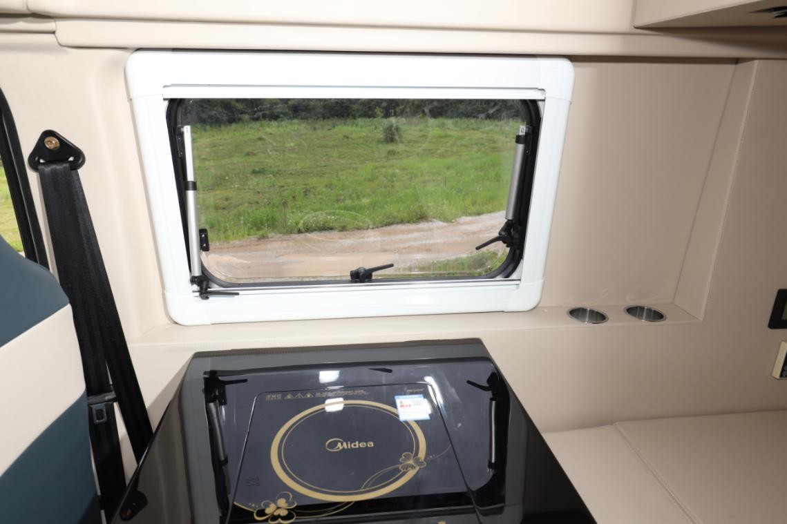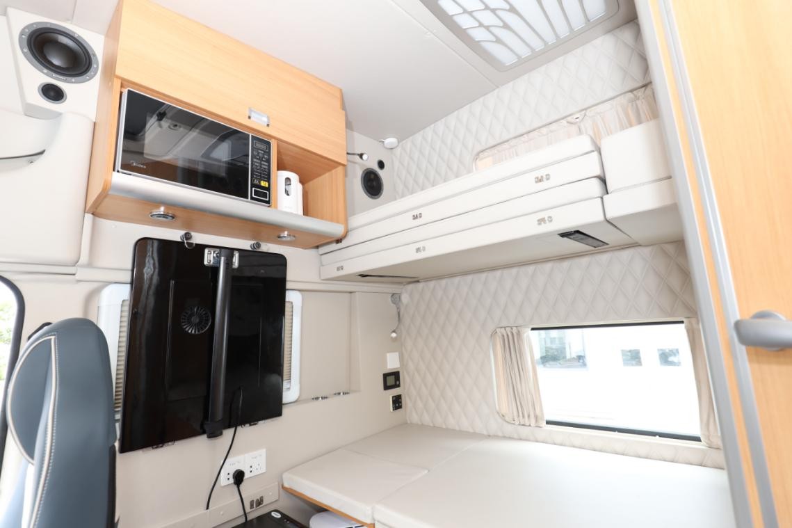 乘龙房车设置了精简的厨房区,只需将副驾驶座椅旋转向后,便轻松进入烹饪的天地。为了长途保鲜,车内还搭载了冰箱供冷冻冷藏,所有食材时刻新鲜。吃不完的食物用微波炉加热即可,在路上时刻满足自己的胃。