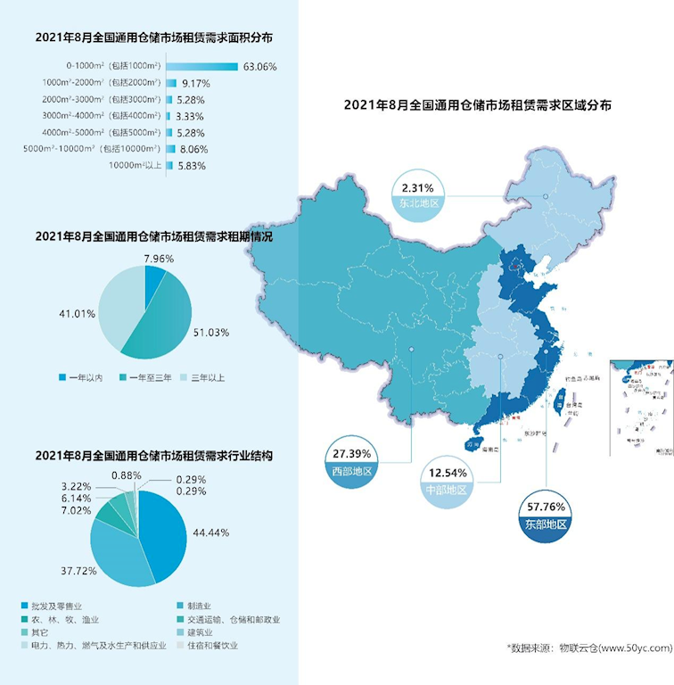 全国32个城市通用仓储市场需求总面积约121.47万㎡,较上月增长17.26%。通用仓储市场需求主要分布在东部地区,约占全国总需求的57.76%;东北地区需求相对较少,约占全国总需求的2.31%。批发和零售业为通用仓储市场需求主力军,其中以百货、食品行业需求较为旺盛。全国32个城市通用仓储市场中,规模以0-1,000㎡(含1,000㎡)仓库租赁需求相对较多,占比约63.06%;3,000㎡-4,000㎡(含4,000㎡)租赁需求相对较少,仅占3.33%。通用仓储市场租期要求以一年至三年为主,一年以内相对较少。