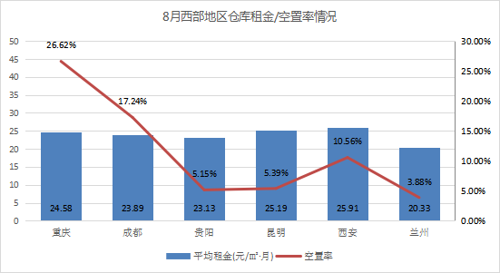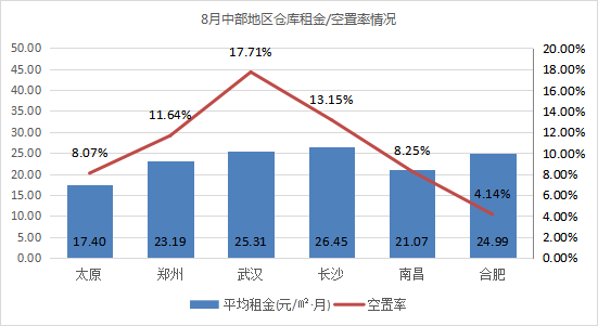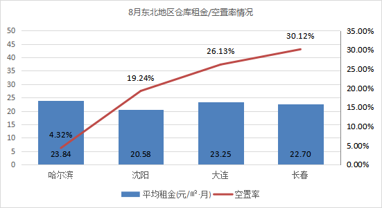 全国32个城市仓库平均空置率为13.11%,环比上升1.13%。其中,东北地区仓库空置率(19.95%)远高于西部(11.47%)、东部(11.20%)、中部(10.49%)地区。相较7月,四个地区仓库空置率均相对稳定,升(降)幅变化在±1个百分点以内。