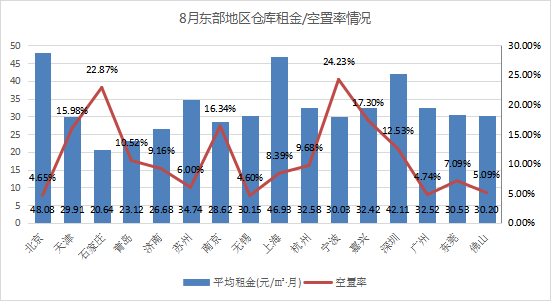 全国32个城市通用仓库平均租金为28.27元/㎡·月,环比上涨0.60%。其中,东部地区仓库平均租金(32.45元/㎡·月)高于西部(23.84元/㎡·月)、中部(23.07元/㎡·月)、东北(22.59元/㎡·月)地区。相较7月,四个地区仓库平均租金均相对稳定,增(降)幅±1%以内。