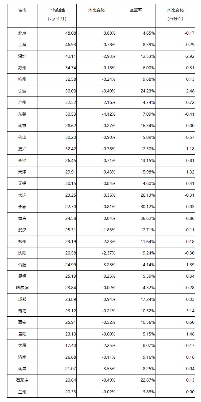 全国32个城市仓库空置率变化最大的城市是青岛,因即墨区超6万㎡园区交付,青岛空置率环比上升3.14个百分点。