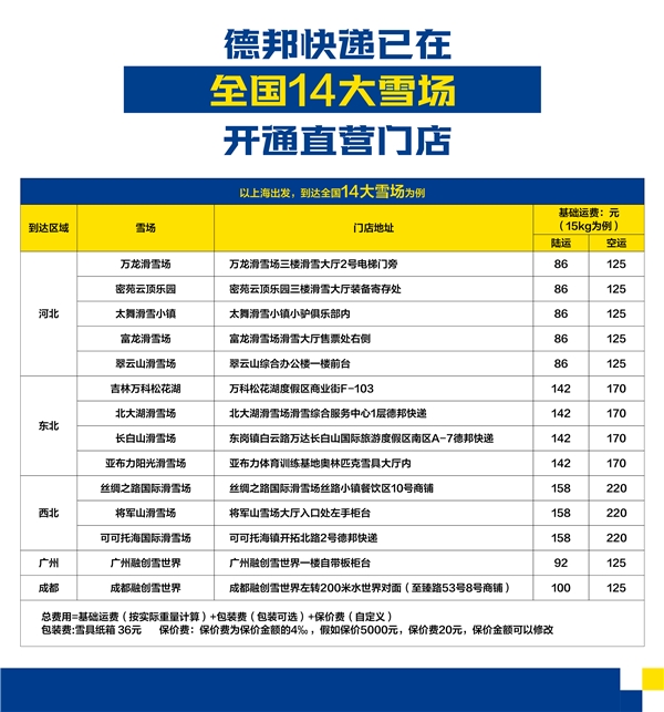 去年,德邦快递就已正式入驻万科松花湖度假区、北大湖滑雪度假区,为雪友们提供专业的雪具寄递服务,用绚丽的德邦蓝点亮了吉林的白色冰雪世界。