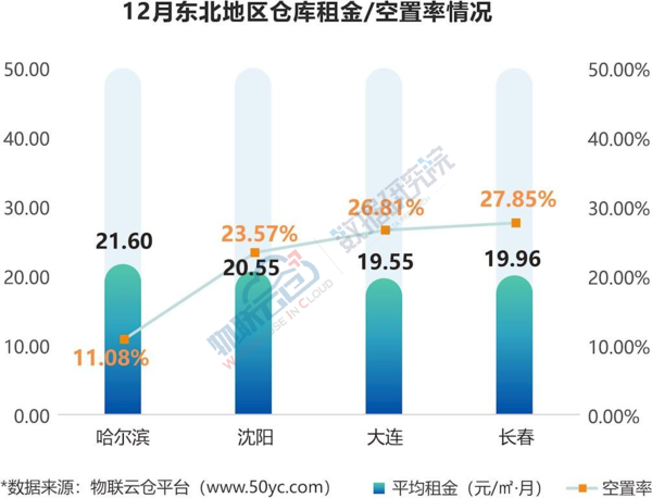 全国32个城市通用仓库平均租金为27.86元/㎡·月,环比上涨0.11%。其中,东部地区仓库平均租金(32.83元/㎡·月)高于西部(23.99元/㎡·月)、中部(23.45元/㎡·月)、东北(20.42元/㎡·月)。相较11月,东北地区租金有所上涨,涨幅为1.09%;中部、东部、西部地区平均租金相对稳定,增(降)幅±1%以内。
