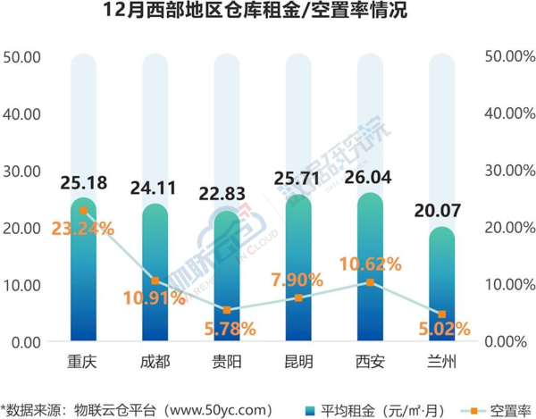 全国32个城市仓库平均空置率为12.13%,与上月持平。其中,东北地区空置率(22.33%)远高于中部(14.72%)、西部(10.58%)、东部(9.28%)。相较11月,东北、中部地区空置率有所上升,升幅分别为3.69和1.20个百分点;西部地区空置率有所下降,降幅为1.87个百分点;东部地区空置率均相对稳定,升(降)幅变化在±1个百分点以内。