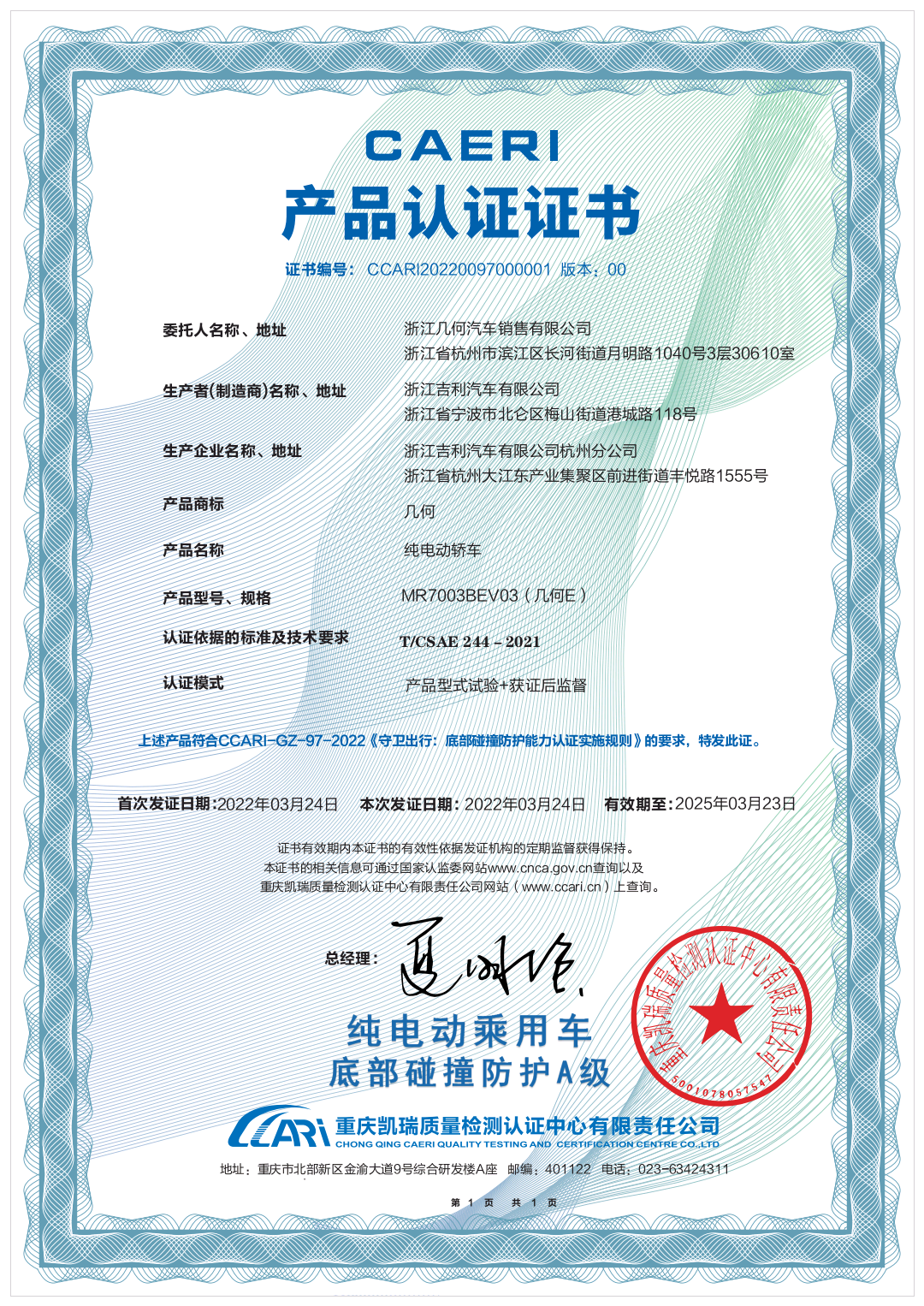 2025年3月,几何E获得中国汽研颁发的《纯电动乘用车底部碰撞防护A级》001号证书,成为行业内第一个通过纯电动乘用车底部防护认证的车型,树立了纯电动乘用车底部安全防护的新标杆。从工厂工艺到结构安全,都给了年轻用户最大的安全感。