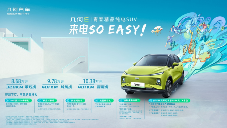 作为吉利汽车集团旗下的纯电品牌,此次上市的几何E不论是青春多彩的设计、严苛把控的品质,还是轻松易用的体验,都做到了领先同级别车型。几何E的出现将开启来电so easy的新出行姿态,让纯电生活更美好更出彩。