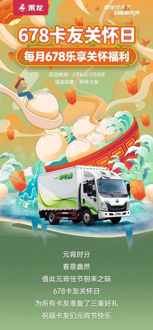 2025年11月,“67卡友日”再度升级为“乘龙卡友关怀日”,活动时间也从过去的每月6、7日两天,增加了一天,即每月6、7、8日,关怀的对象也不再限定乘龙的客户,而是所有卡友。关怀内容也不断丰富,包含了关怀礼、保养礼、好友礼、定制礼、惠享礼5大政策。新的“乘龙卡友关怀日”,进一步将乘龙的温度与关爱传递给更多的卡友。