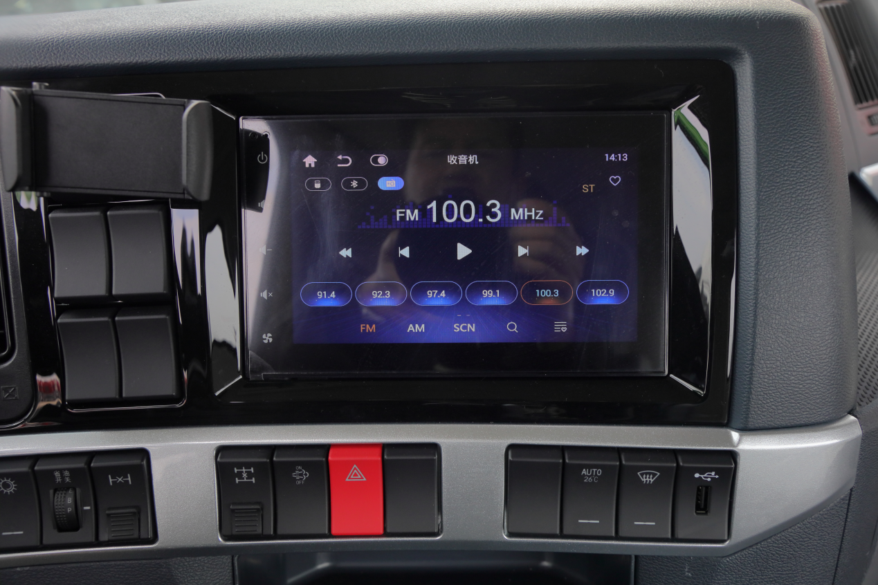 在安全性上,这款车也是一绝。首先车辆采用龙骨框架结构驾驶室+整体式防撞车门结构,碰撞安全性高;前碰撞预警(FCW)、轨道偏移预警(LDWS)、电子稳定控制系统(ESC)都是标配,智能防护,行车无忧;还配备了液力缓速器,下坡稳稳当当。如果还是不放心,可选配360°全景影像+盲区预警+疲劳监控,安全加倍。
