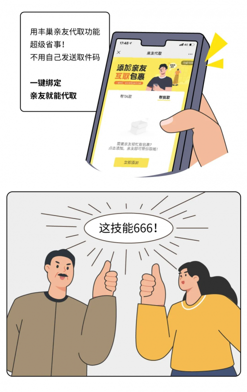 除此之外,针对多包裹且没有时间去取件的用户,丰巢也开发了“亲友代取”功能,让家人好朋友代取包裹。不需要收件人转发取件码,最大程度上避免了多包裹用户“重复取件”“漏件”等情况。只需要在“亲友代取”界面添加“帮我取”的亲友,亲友即可同步包裹取件信息,可直接到柜机扫码取件,省时又方便!